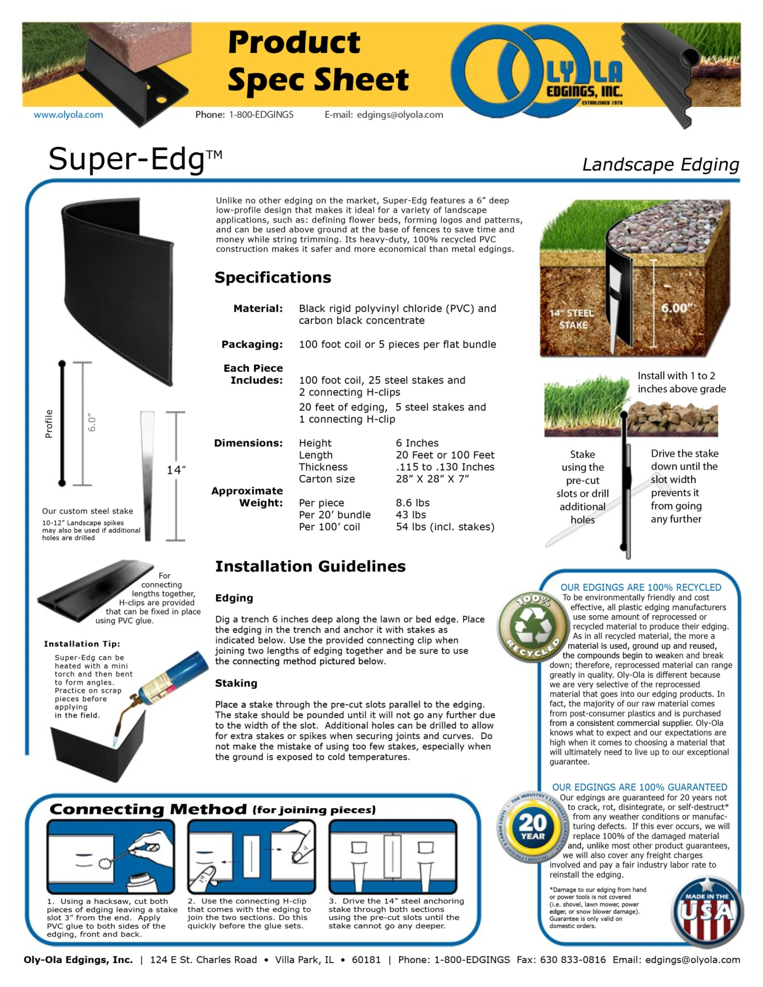 Super-Edg’s™ heavy-duty 100% recycled PVC construction makes it a safe and economical edging product. Manufactured in the USA as a commercial grade plastic edging. Pre-cut slots for staking every 2 feet; stakes provided for staking every 4 feet. Purchase additional stakes and H-clips if you wish to stake every 2 feet.