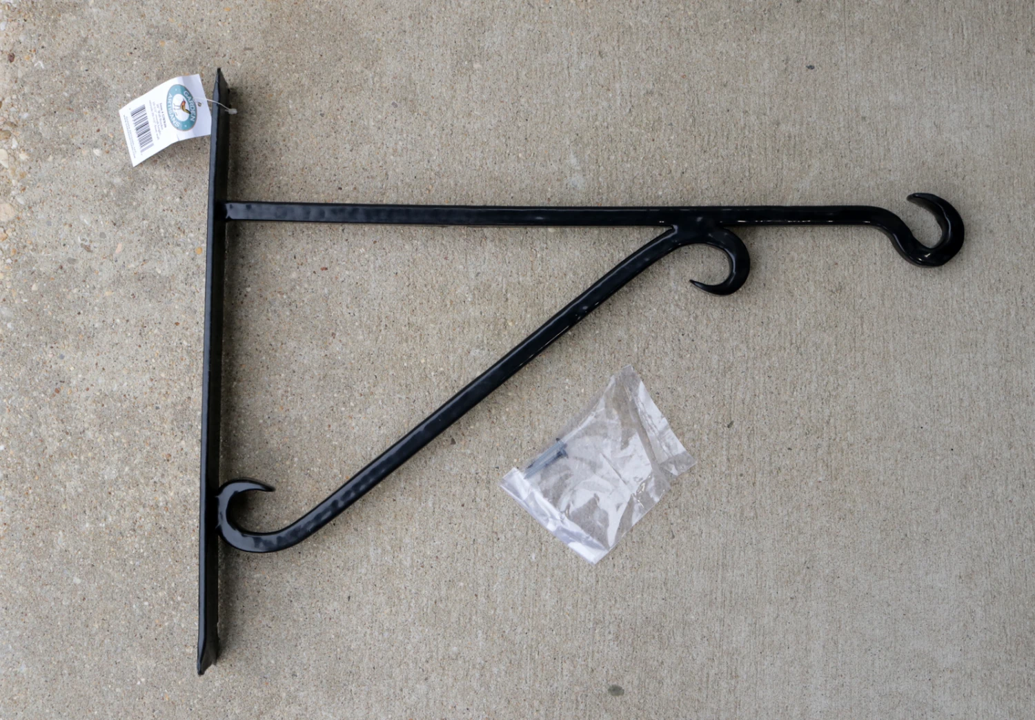 20″ Steel Wall Bracket thickly coated in black plastic. Tubular steel scroll; solid back plate with 2 mounting holes.