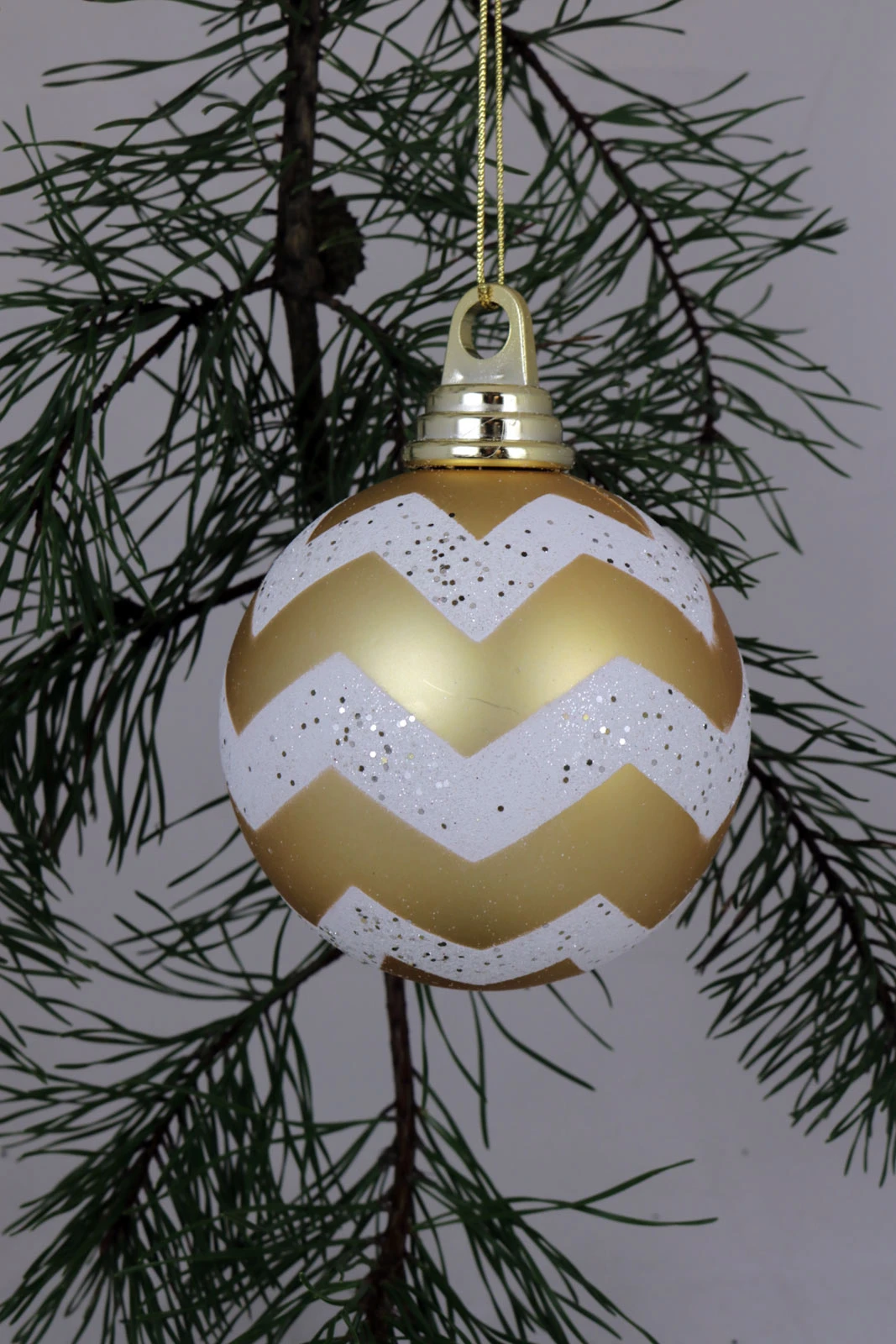 4″ shatterproof ball ornament with a gold and white Chevron design.