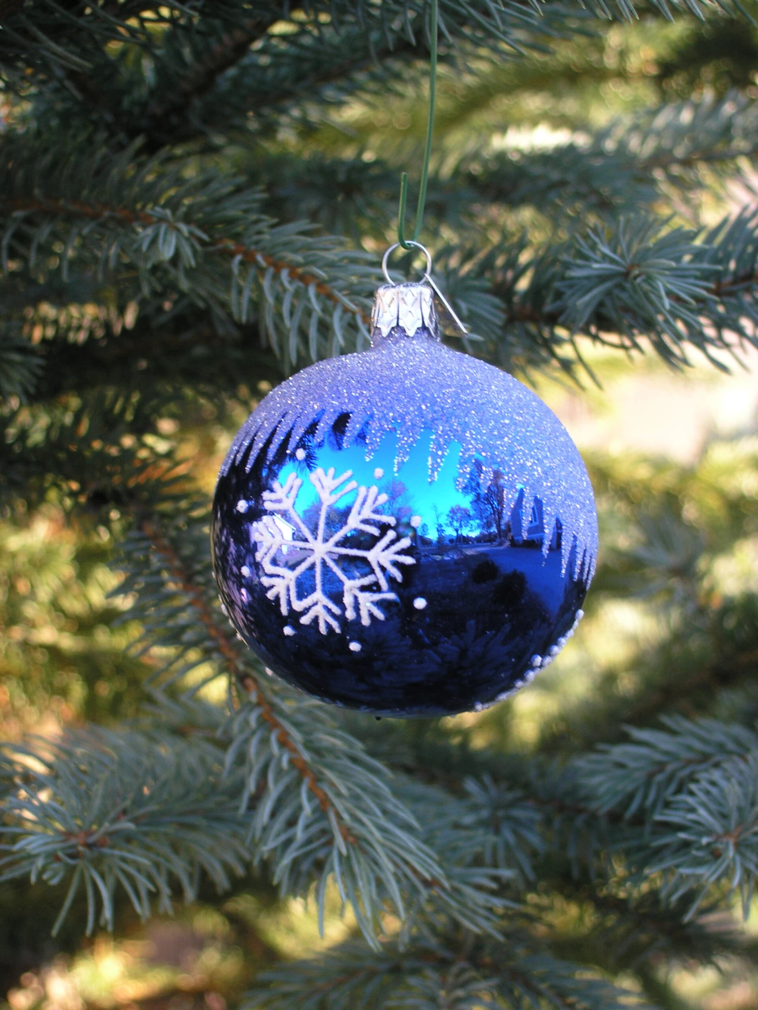 A striking blue glass ball ornament hand blown and decorated in the Czech Republic where there has long been a tradition for hand-crafting Christmas ornaments.