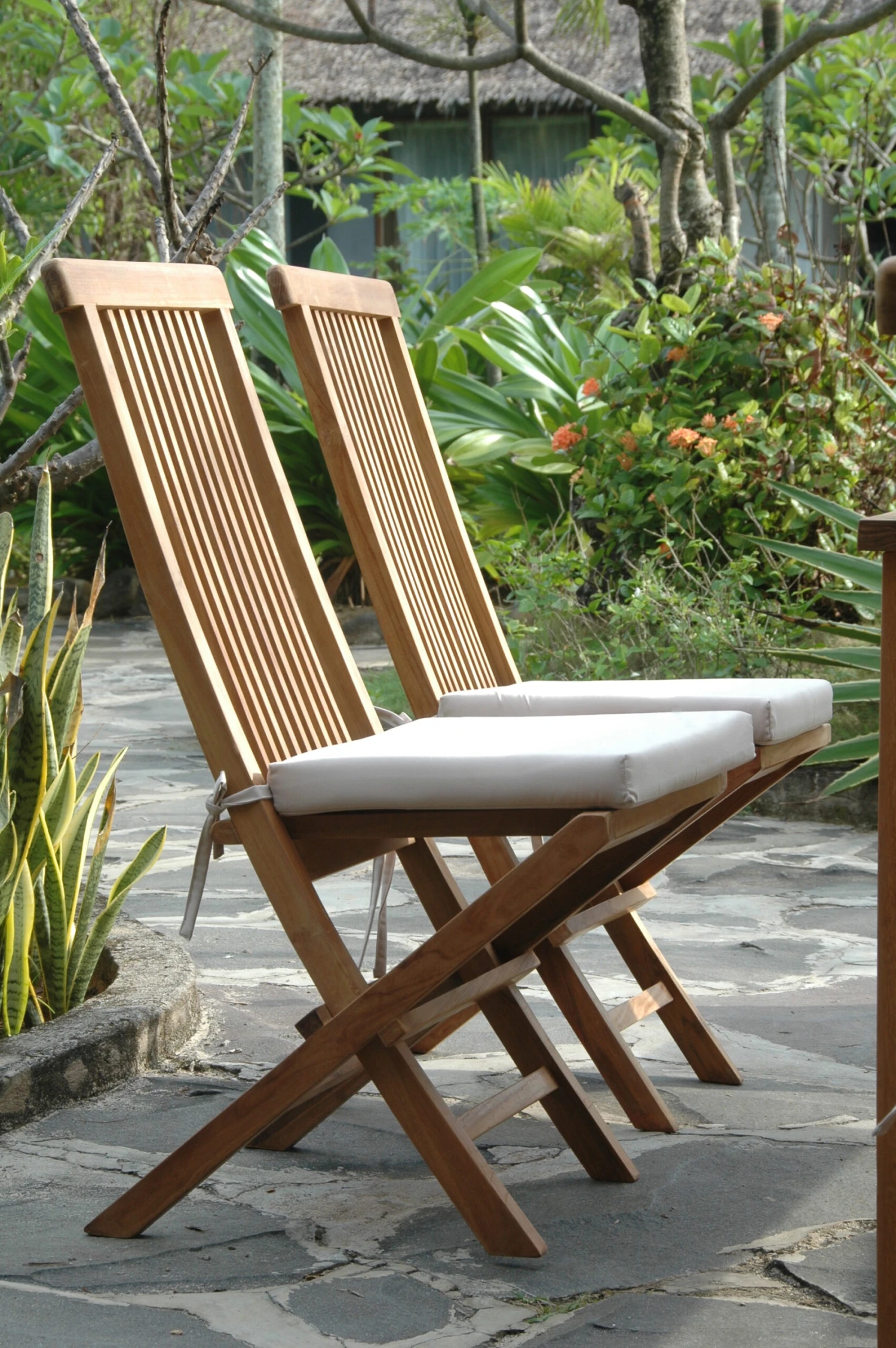 Beautiful teak folding chairs – set of 2. Convenient folding design allows for space-saving storage during off-season and easy setup when the weather is nice. Cushions not included.