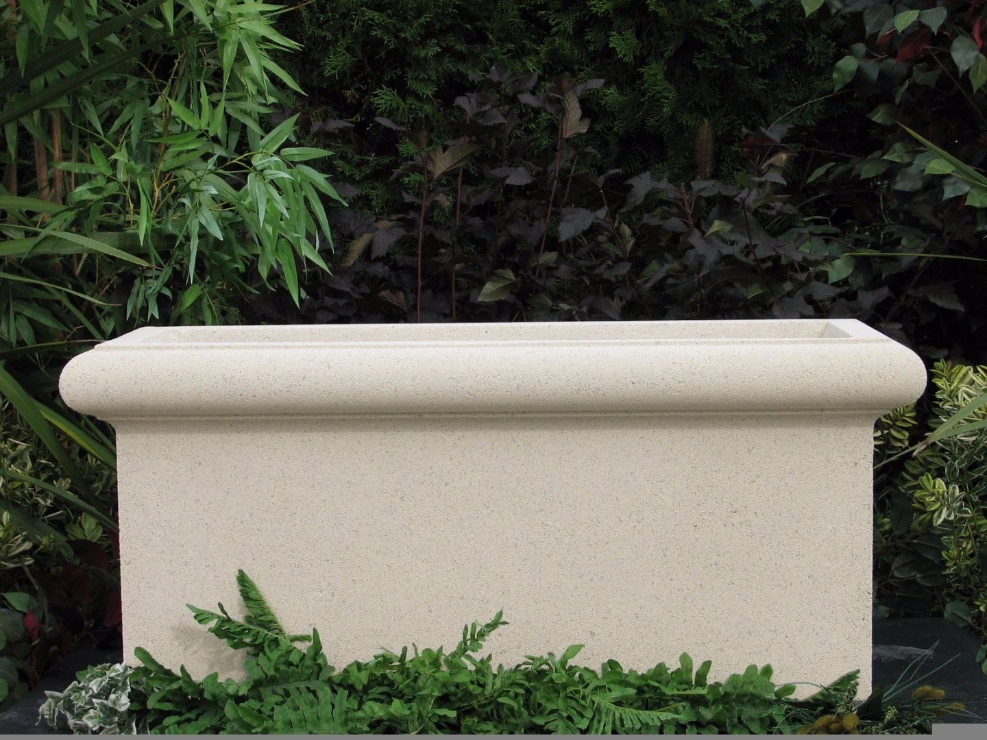The Chelsea Trough is a rectangular cast stone planter with a thick rolled top lip. Complements the Chelsea Tall and Chelsea Box planters.