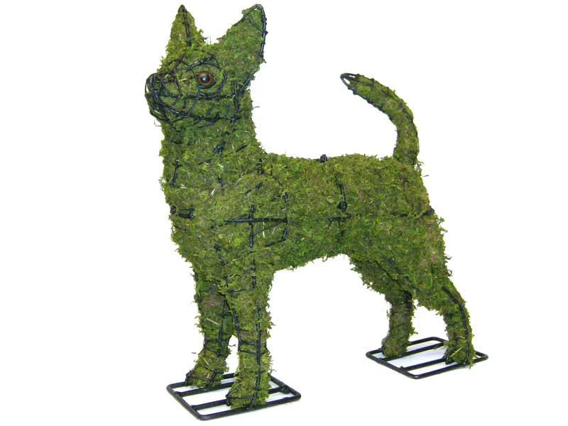 Chihuahua Topiary offered as frame only, filled with pre-dyed sphagnum moss or lit. Heavy-gauge wire frame powder coated black.