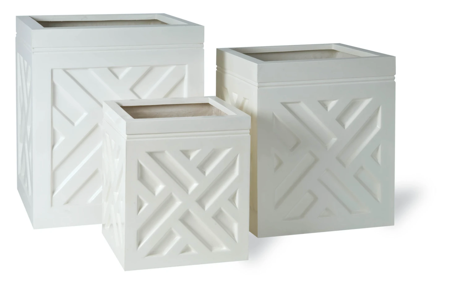 The Chippendale square planters are crafted from lightweight and durable fiberglass – ensuring long life. Offered in 12″, 15″ and 18″ squares and a gloss white finish.