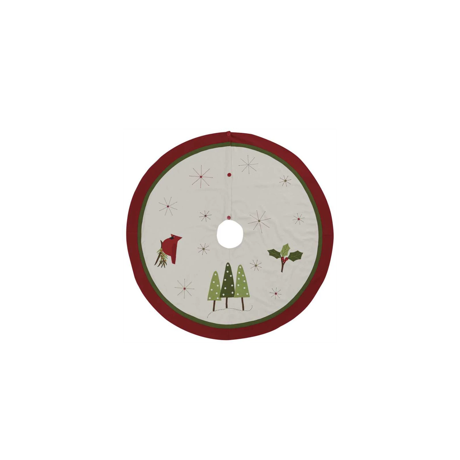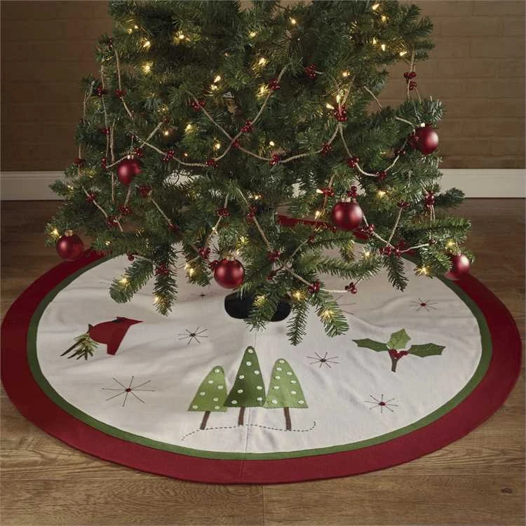 Large 52″ diameter felt Christmas tree skirt decorated with winter greenery and an applique bright red cardinal.
