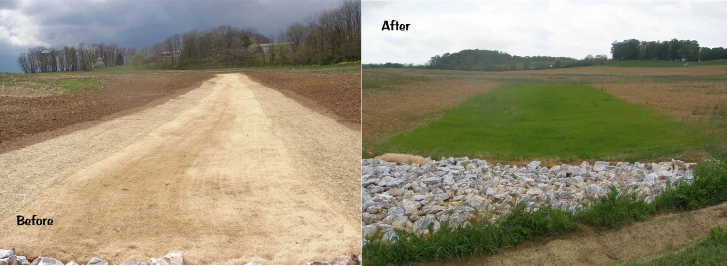 Before installing Curlex blankets, the seedbed shall be inspected by the Owner’s Representative to ensure it has been properly compacted and fine graded to remove any existing rills. It shall be free of obstructions, such as tree roots, projections such as stones, and other foreign objects. Grass seed shall match soil conditions to allow for maximum germination, dense vegetations, and a structural root system. Contractor shall proceed when satisfactory conditions are present. After the area has been properly shaped, seeded, fertilized, and compacted, locate the start of the roll, making sure the roll is facing toward the area to be covered, and then roll out the blanket. Blankets shall be rolled out flat, even and smooth without stretching the material and then anchored to the subgrade.