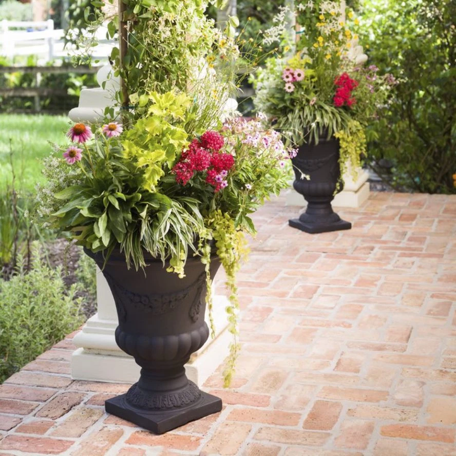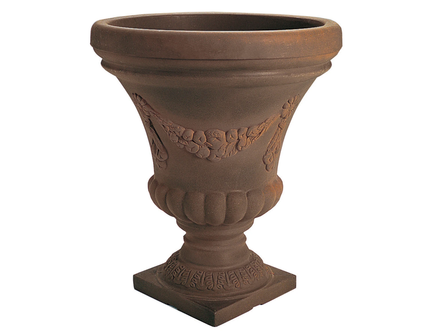 The Festonada Urn from Crescent is a large lightweight resin urn with a Mediterranean classic garland design. Measures 19″ x 23″.