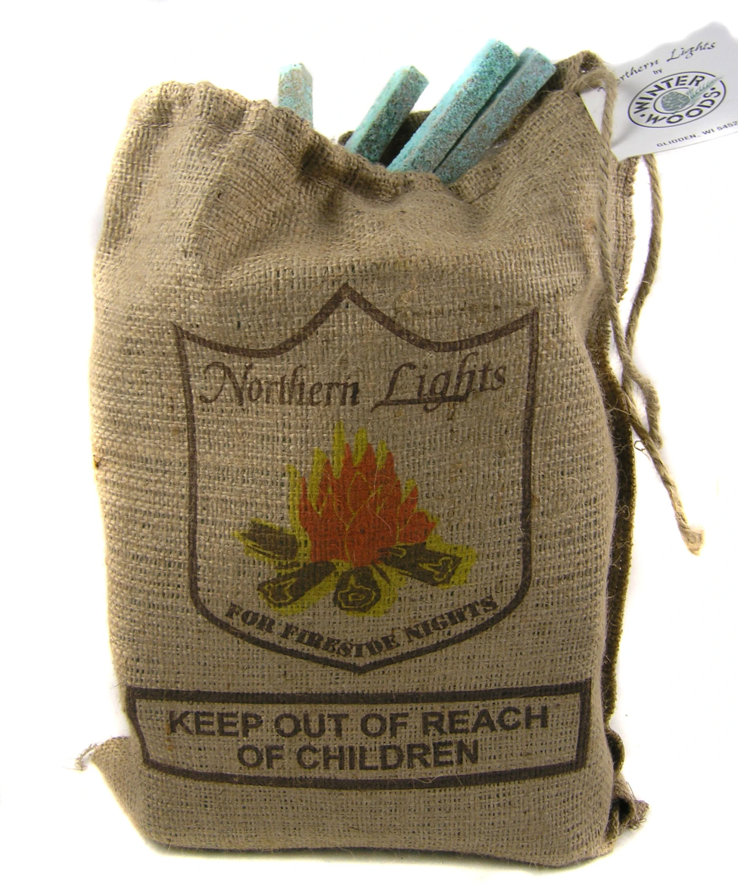 3 lbs. burlap bag of fire color sticks. Each stick will produce beautiful blue and green flames while burning.