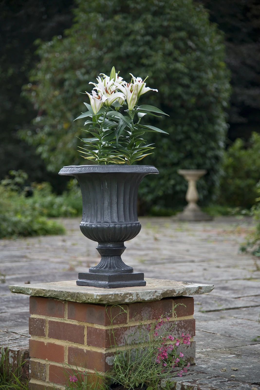 Our standard finish choice for the Fluted Urn planter is the Faux Lead.