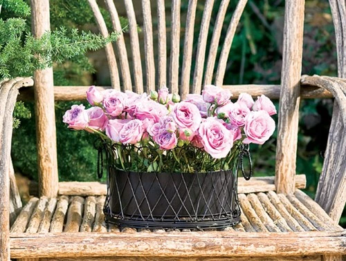 Our lovely French-style garden basket with its lattice –patterned twists of wire is offered in black. A removable metal insert doubles the applications of this elongated basket.