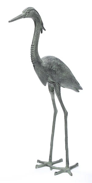 This Great Blue Heron with grey and blue verdigris finish stands 43″ tall. Cast from aluminum – ensuring a long life. Ground stakes supplied.