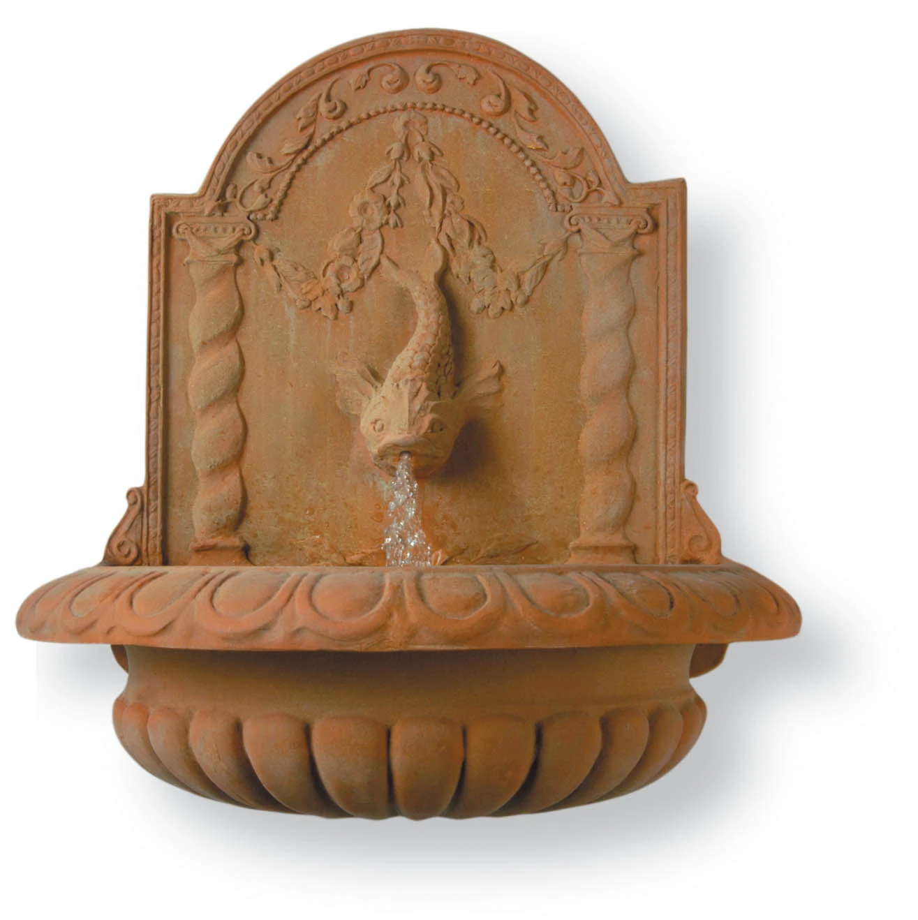 This large fiberglass wall fountain comes in a Terracotta finish. The bowl has a beautiful egg and dart pattern around the rim. Spiral columns offset the large spouting fish. The arched top is enhanced with a decorative leaf pattern.