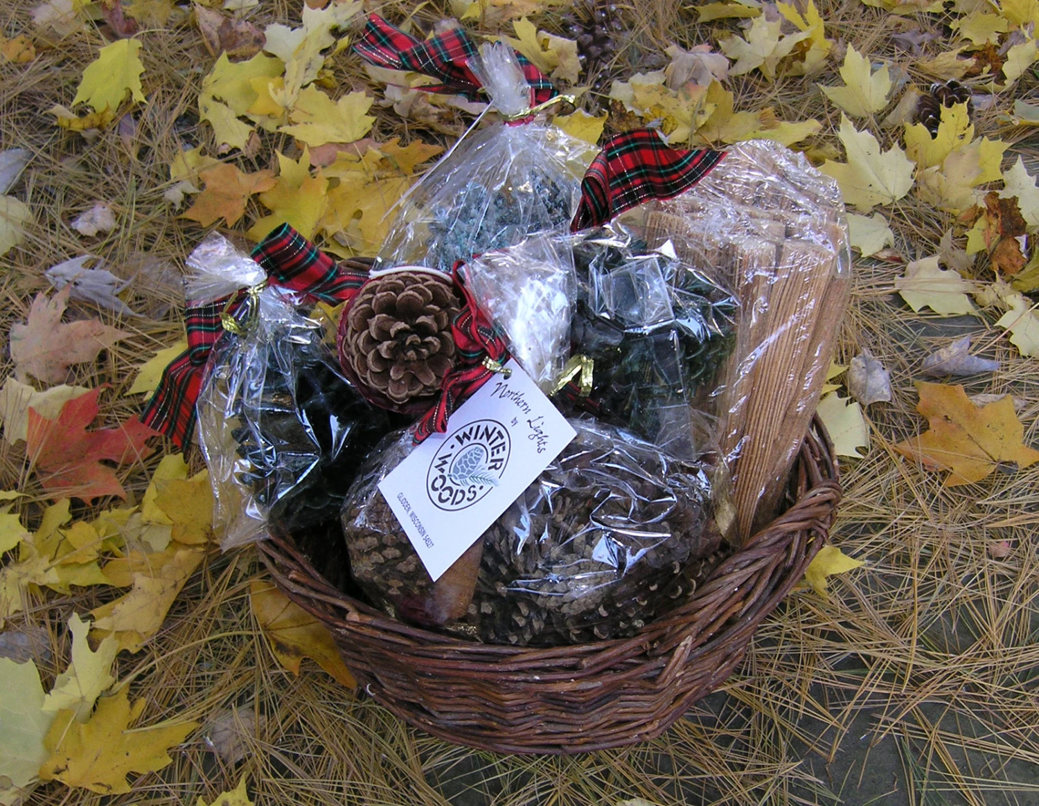 A two-handled wicker basket packed with 2 pounds of fatwood, 1 pound of color cones, 2 wax bottom buddies, 1 pound of Cinnamon Pourri and 2 porcupine eggs (waxed and scented pine cones).