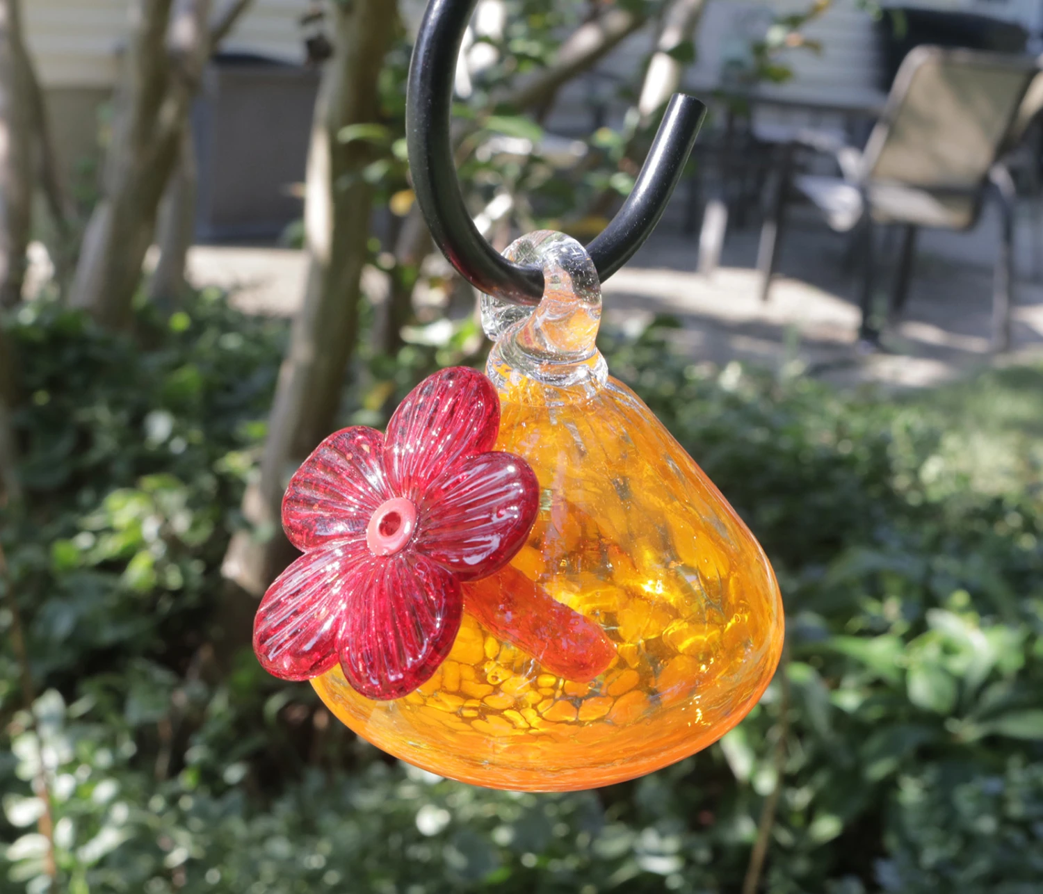 Beautifully crafted hand-blown glass Hummingbird Feeders – just the right size to ensure always fresh nectar for our hummingbird friends. Due to the handcrafted nature of this feeder, size, shape and color variations will occur. Crafted by US glass artist Maggie Bean.