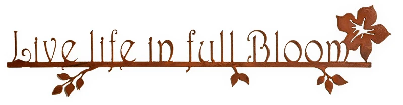 Live Life in Full Bloom – wall sign crafted from 14-gauge steel. Made in the USA! Steel is left in a natural state but sealed. No mounting brackets – just use points on sign to hang on nails.