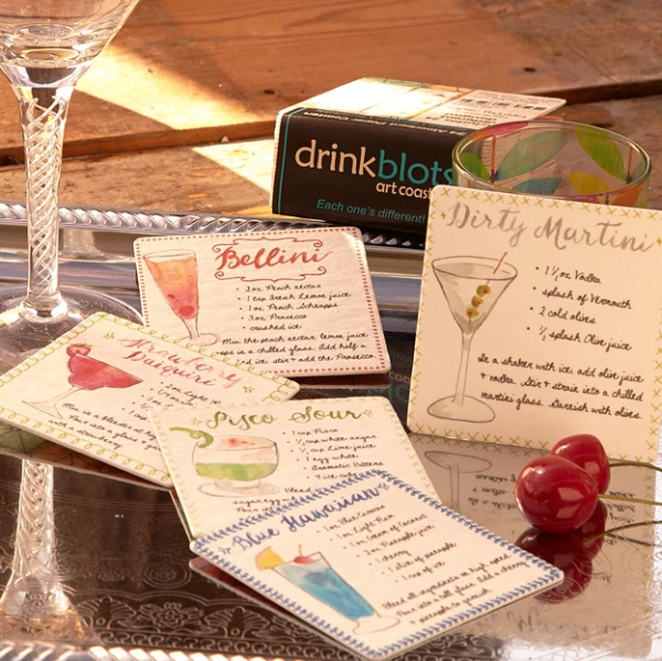 Paper coasters designed by FarmDog Studios. Each coaster has its own drink recipe.
