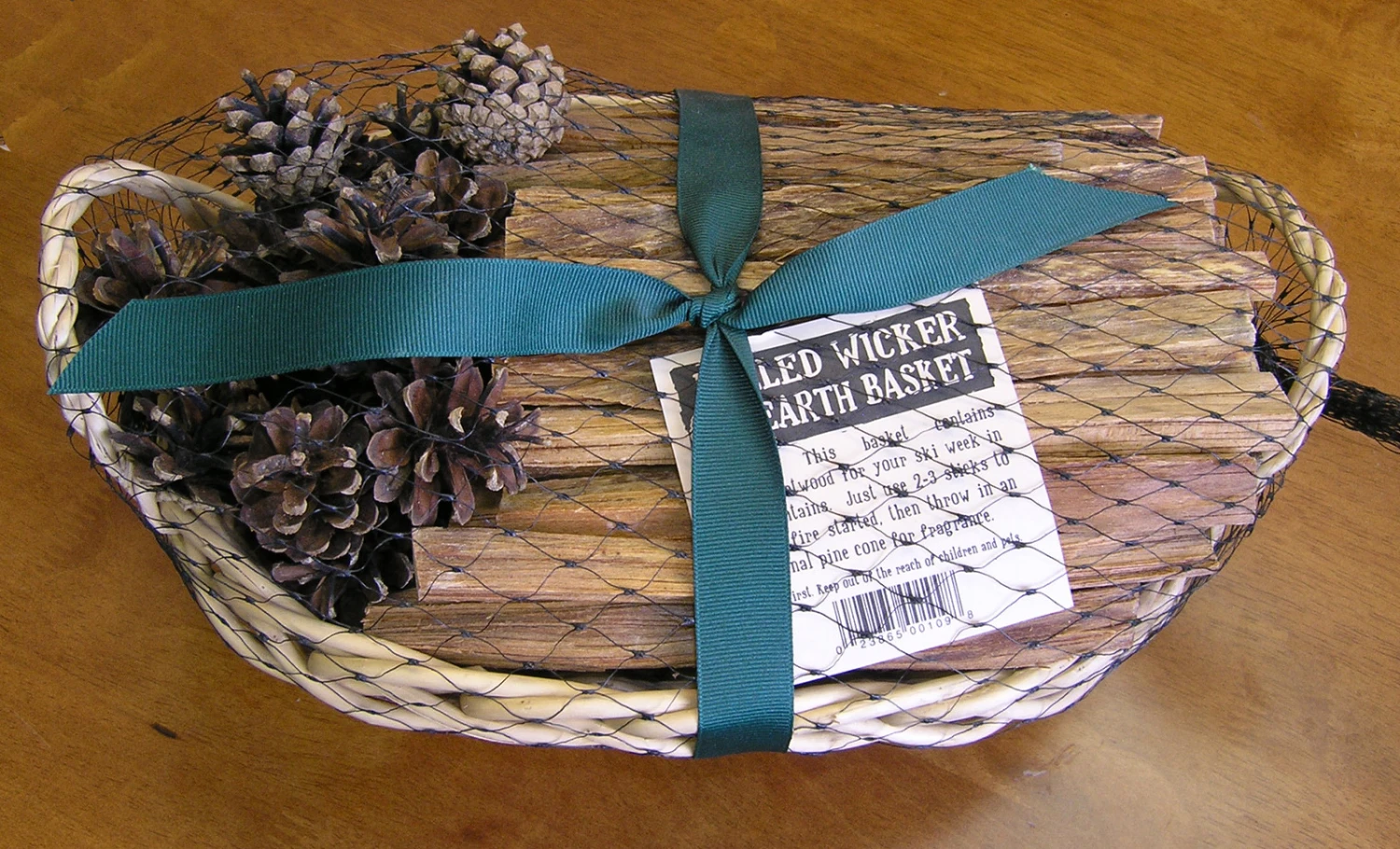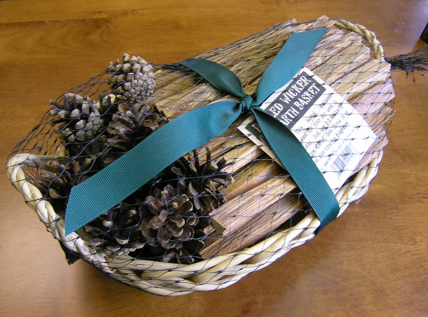 Wicker basket with 4 lbs. fatwood and small pine cones. Basket measures 14″ x 9″ x 5″. Makes starting that fire on cold, blustery days a snap! Makes a lovely hostess gift.