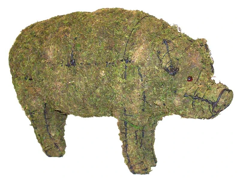 Pig Topiary filled with pre-dyed sphagnum moss. Heavy-gauge wire frame powder coated black.