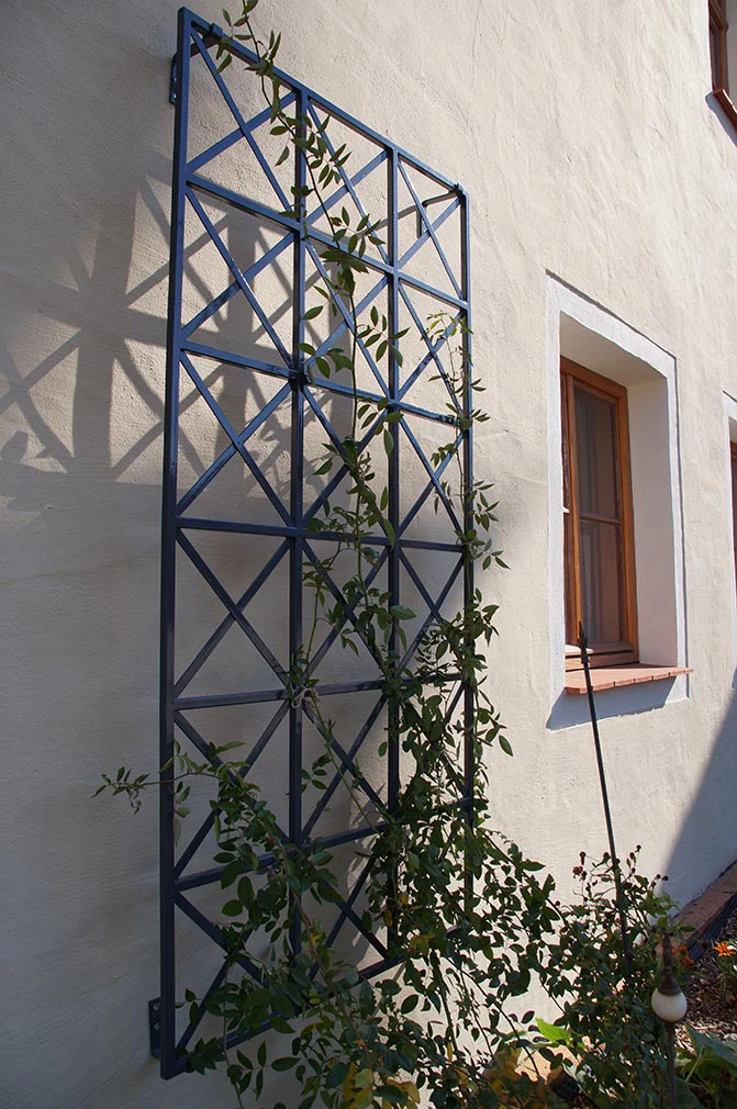 The Ravenna metal wall trellis is a design inspired by the late-classical shape of Ostrom. In the past, wall trellises of this type were mainly used as railings and to protect windows but are ideal for climbing roses and ramblers. The shoots are optimally held on the stable bands and profiles.