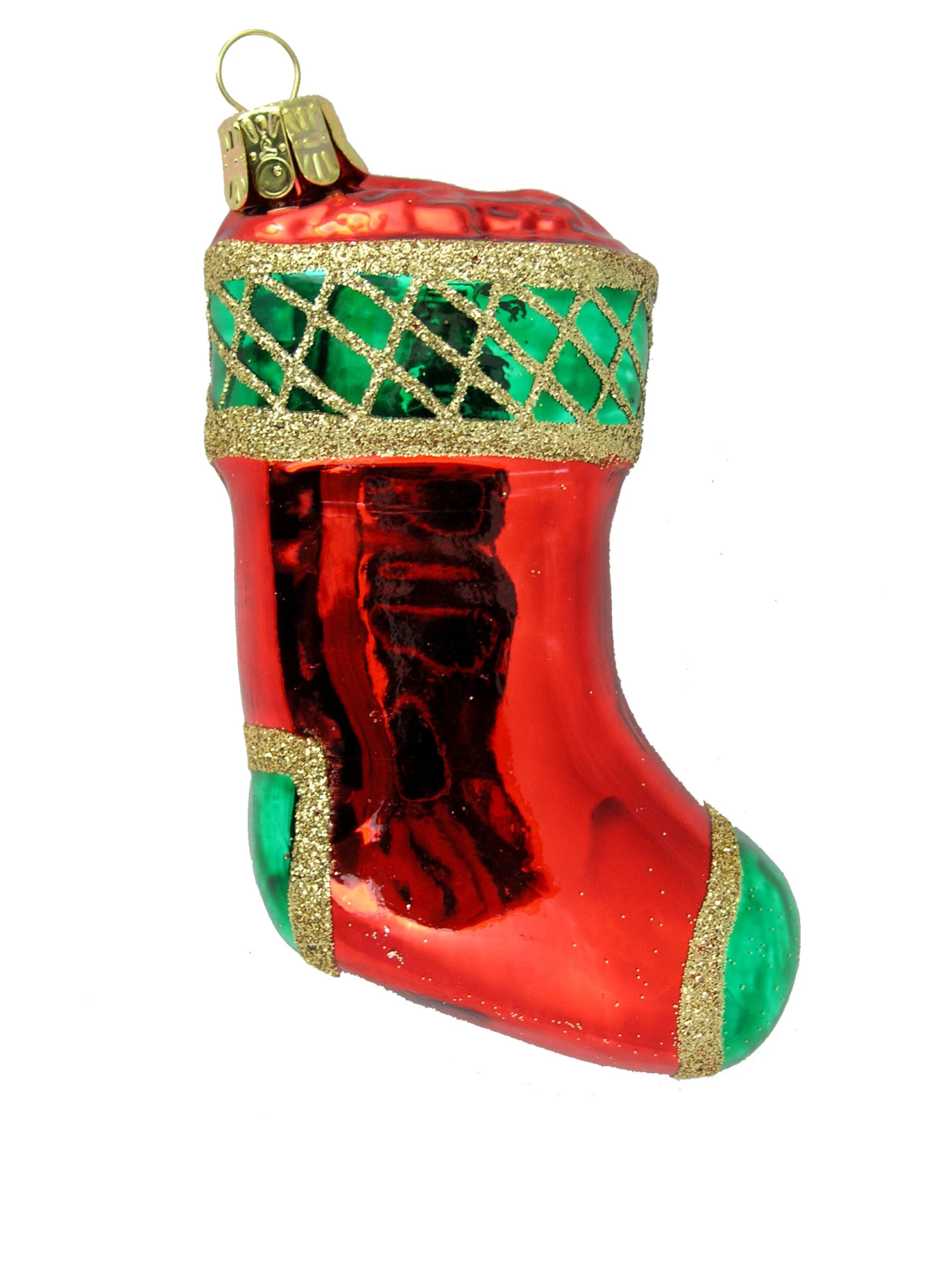 Red Stocking ornament with green and gold accents. Made by hand by glass artisans in the Czech Republic. This little stocking will add a classic look to your tree.