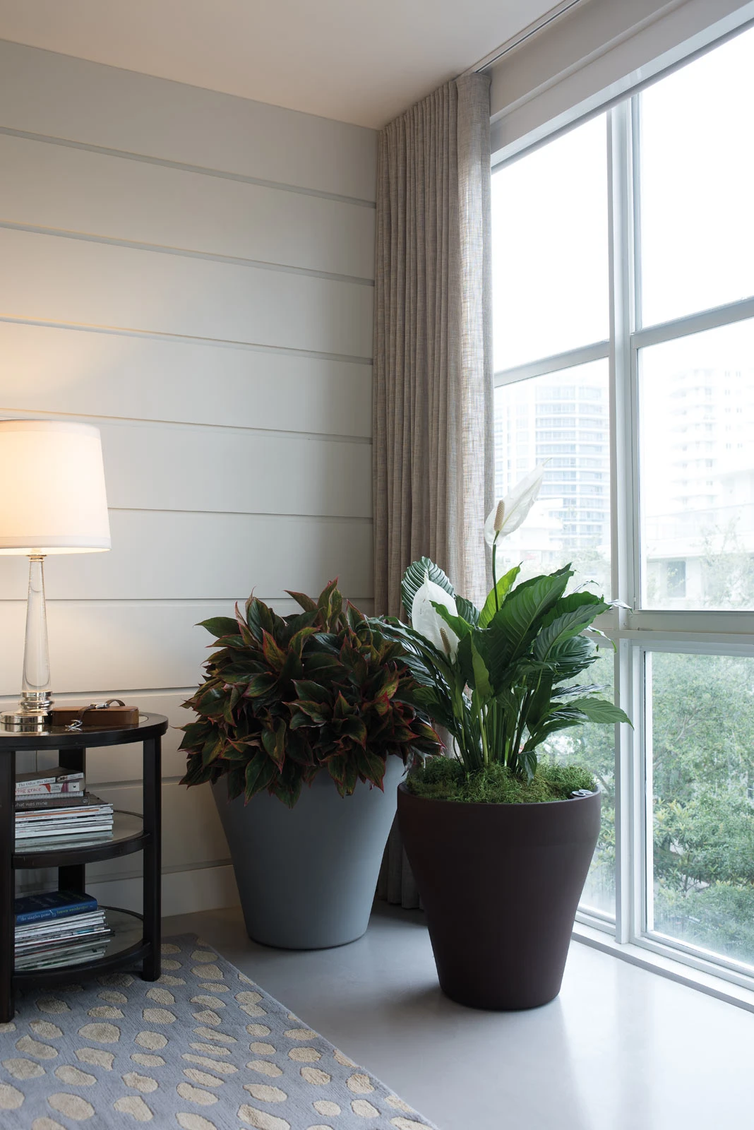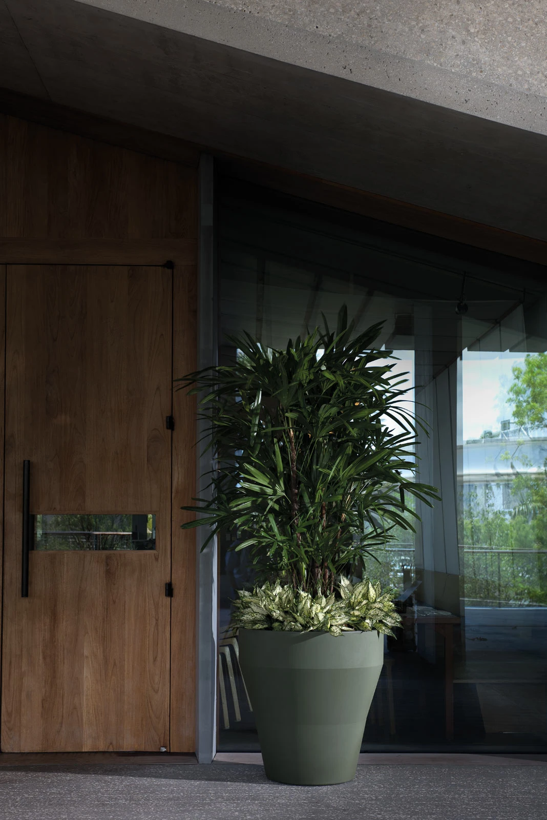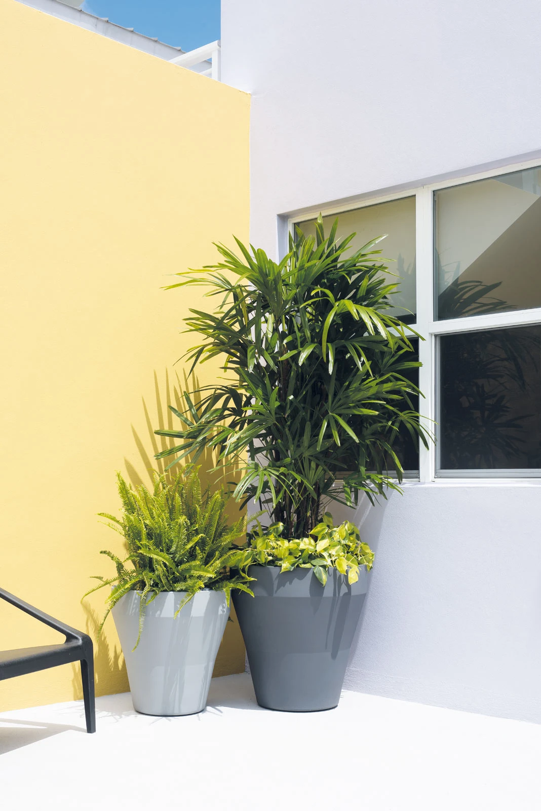 The Rim planters from Crescent are a reservoir planter with the TruDrop® system. They have a smooth texture and come in 18″, 23″, 26″ and 30″ and several color choices.