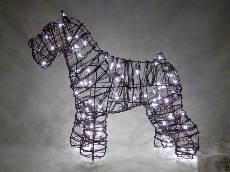 Schnauzer Topiary offered filled with pre-dyed sphagnum moss, frame only or a lighted version. Heavy-gauge wire frame powder coated black.