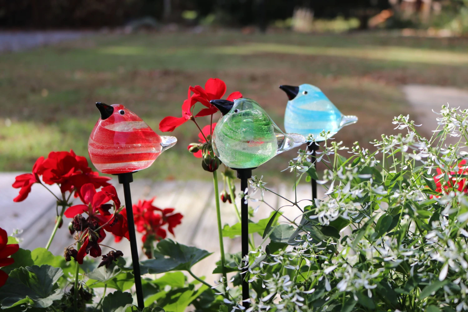 Glass Bird Stake standing 18″ tall. Birds measure 4″ L x 2.25″ W x 2.75″ H. Offered as a set of 3, one each color.