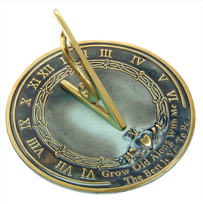 The Grow Old with Me sundial is crafted from solid brass and given verdigris and polished highlights and has a 10″ diameter. The Robert Browning’s poem “Grow old along with me, the best is yet to be” is probably the most loved quotation that we use on sundials. This solid brass sundial has a knot work design and a beautiful Irish claddagh centerpiece, which symbolizes everlasting love.