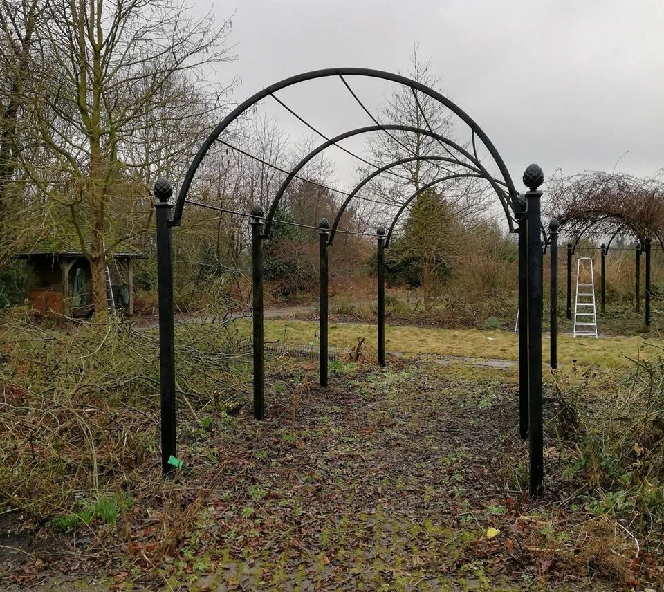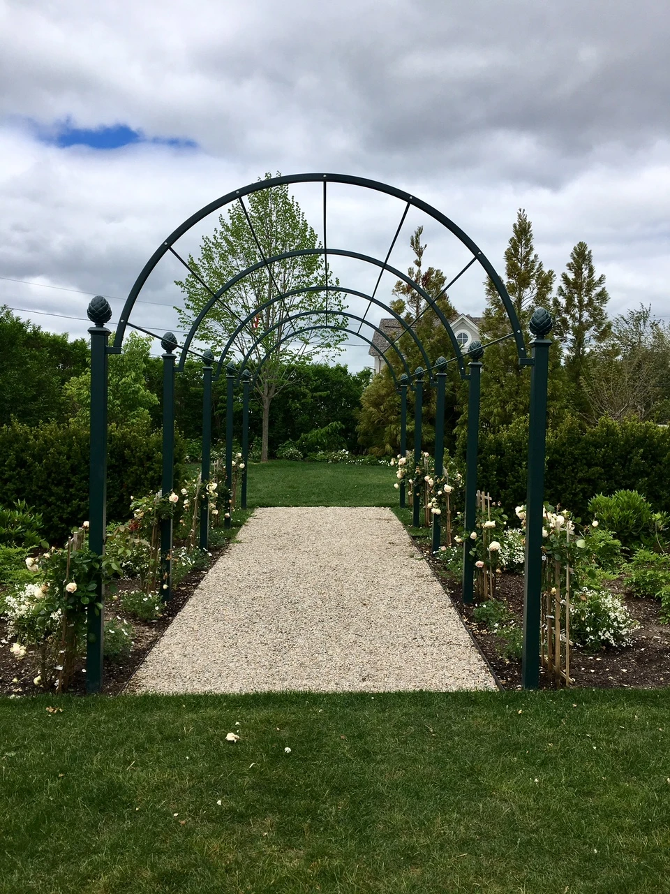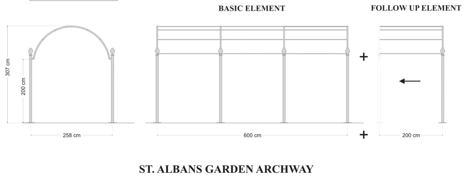 While we cannot offer custom configurations or the elliptical pergola shown in the above pictures, we do offer a straight tunnel version of the St Albans Garden Archway.