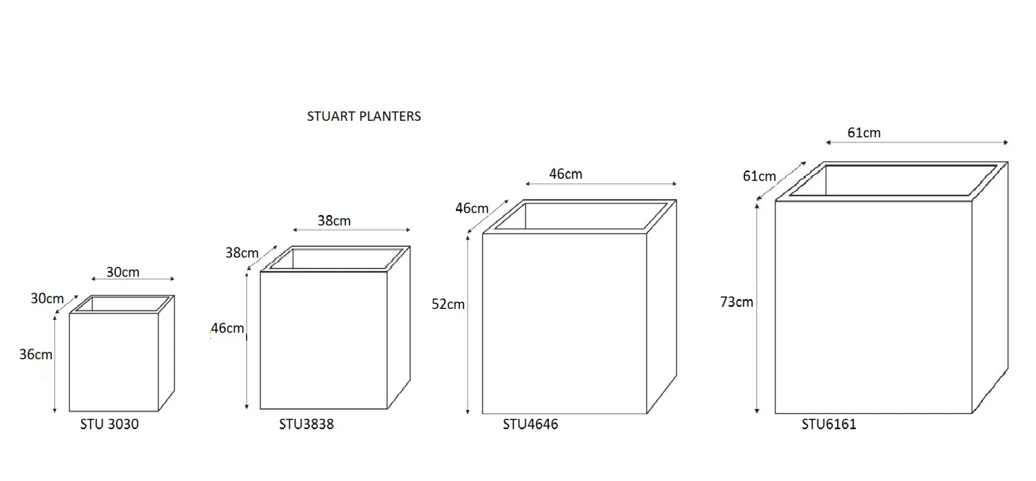 | STU3030 | 12″ Square Planter | 12″ x 12″ | 12″ x 12″ | 14″ | 6.6 | 1 |