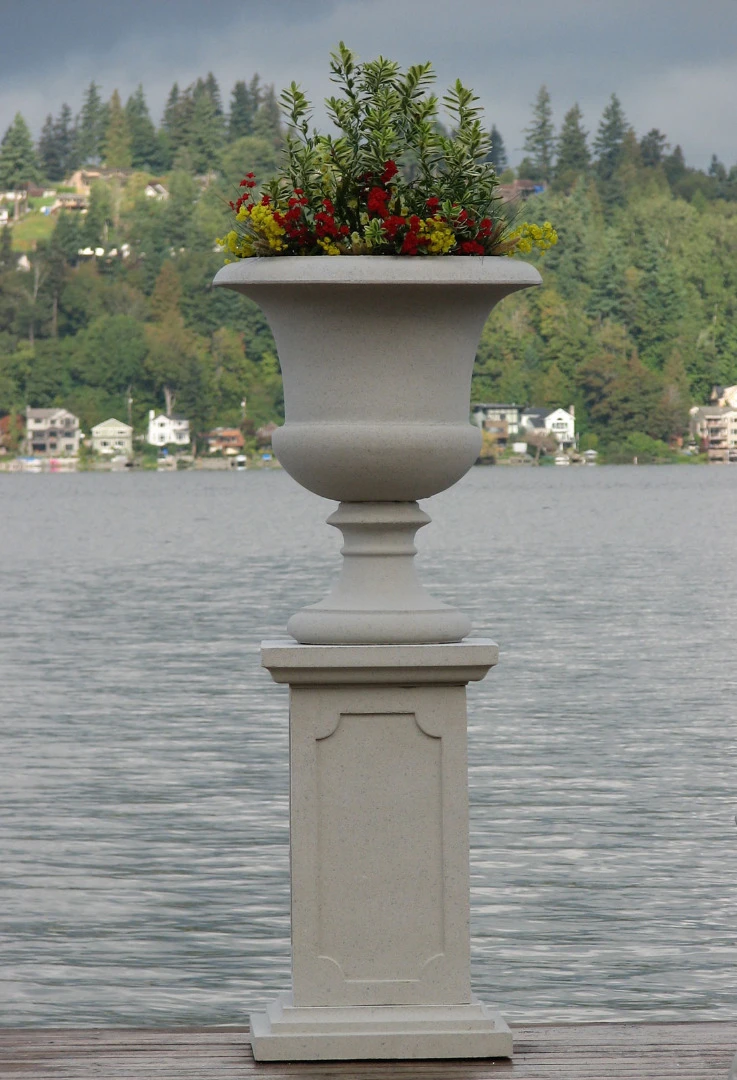 This planter is crafted from cast stone, superior to cast concrete in look and feel. Cast stoneis a concrete based building material manufactured and molded to simulate natural cut stone. Nichols Bros.’ dry cast products are made from zero slump concrete, using the Vibrant Tamp Method, in a rigid mold, until it is densely compacted.