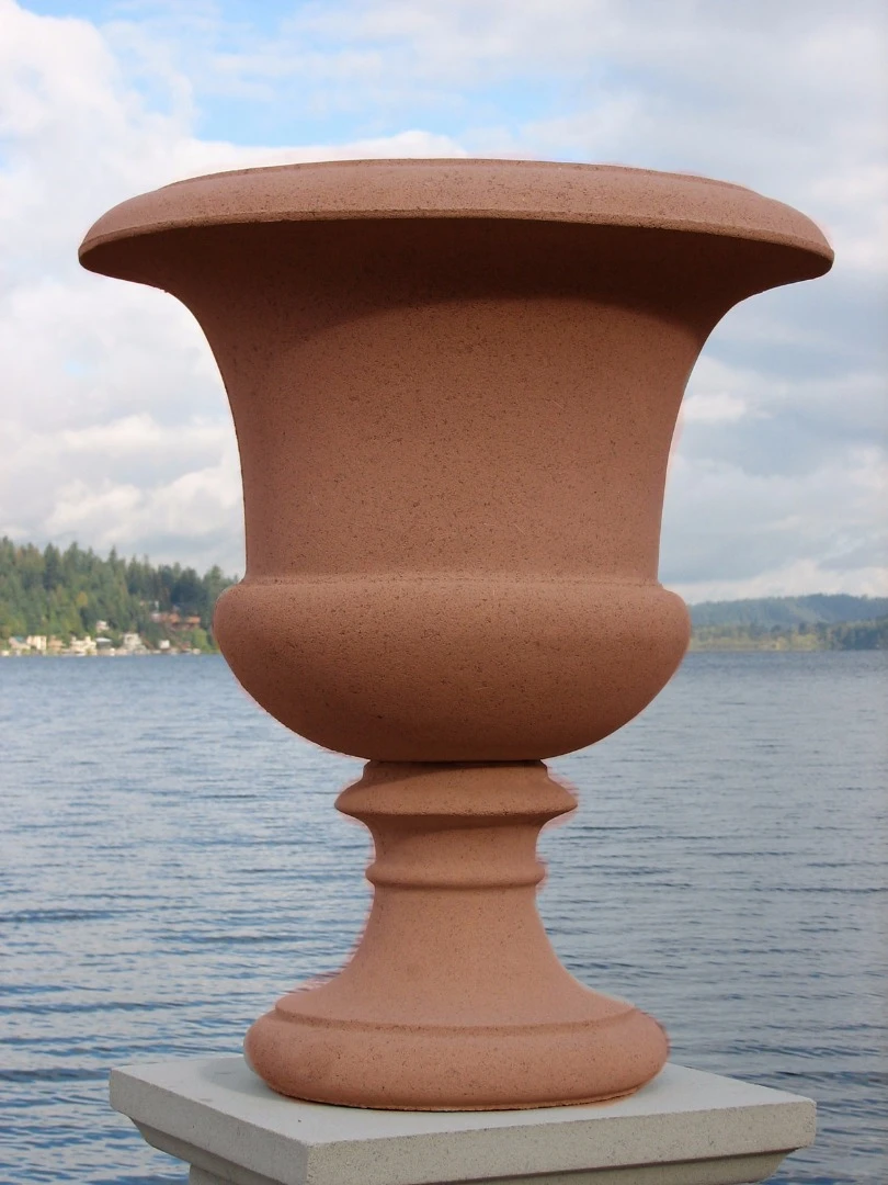 Cast stone Victorian Vase is an urn style planter offered in two sizes and five color choices: creme, limestone, tan, terracotta and pewter.