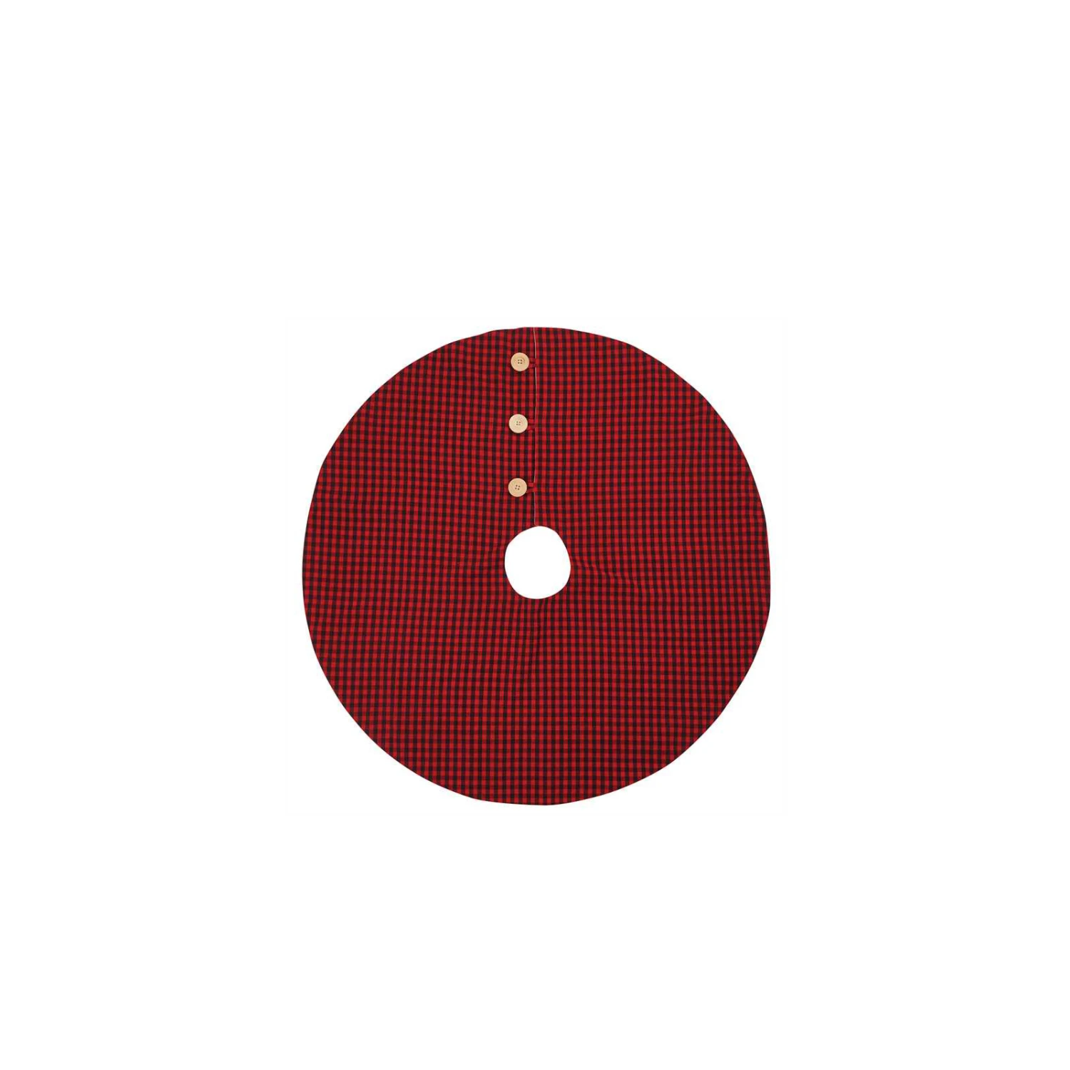 Large 52″ diameter Yuletide Tree Skirt with a red and black gingham print. Back lined with solid white cotton. Large wooden buttons hold the skirt in place.
